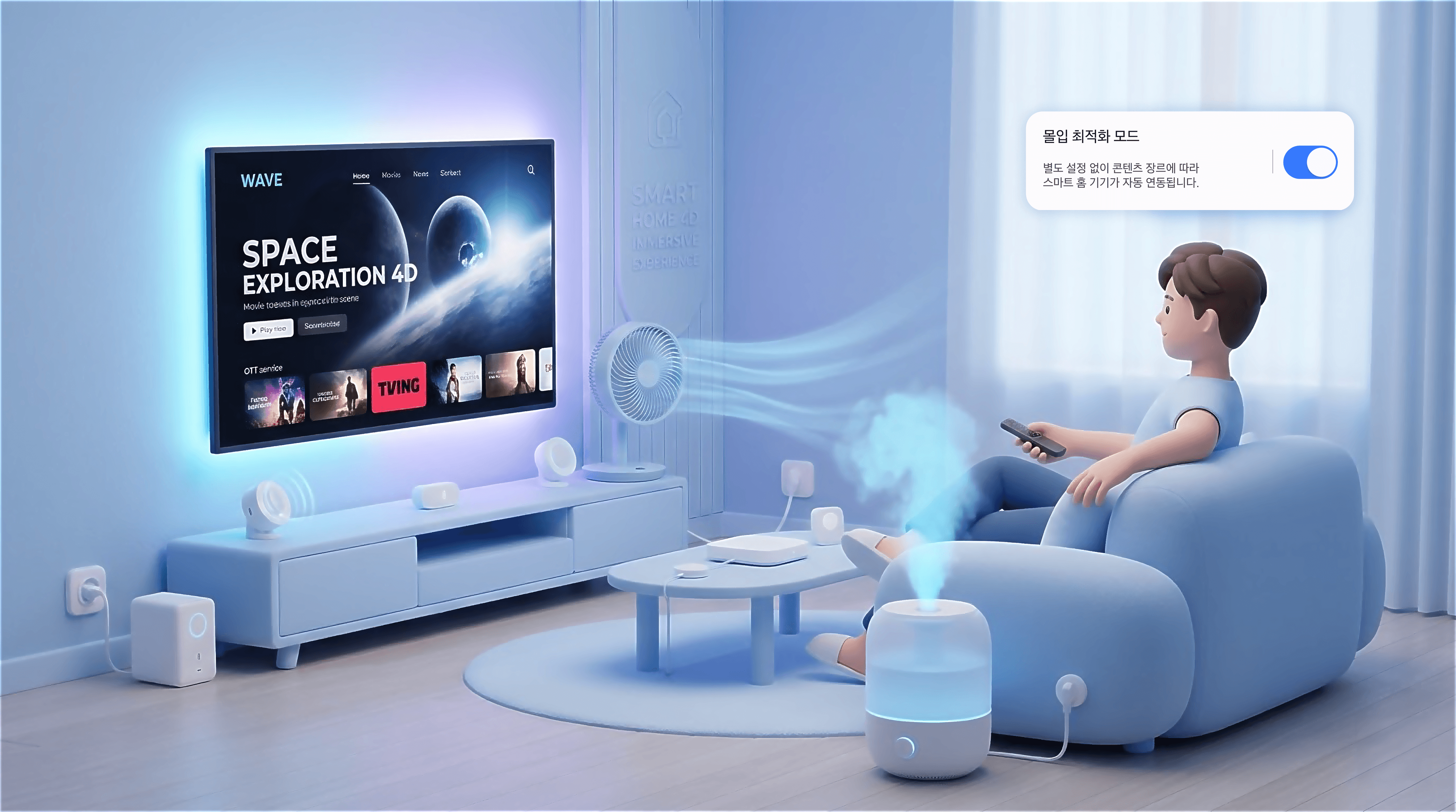 스마트 홈 기기를 활용해 감각 자극을 OTT 시청 환경과 연동함으로써, 개인화된 환경에서도 영화관 수준의 몰입 경험을 제공하는 서비스를 제안